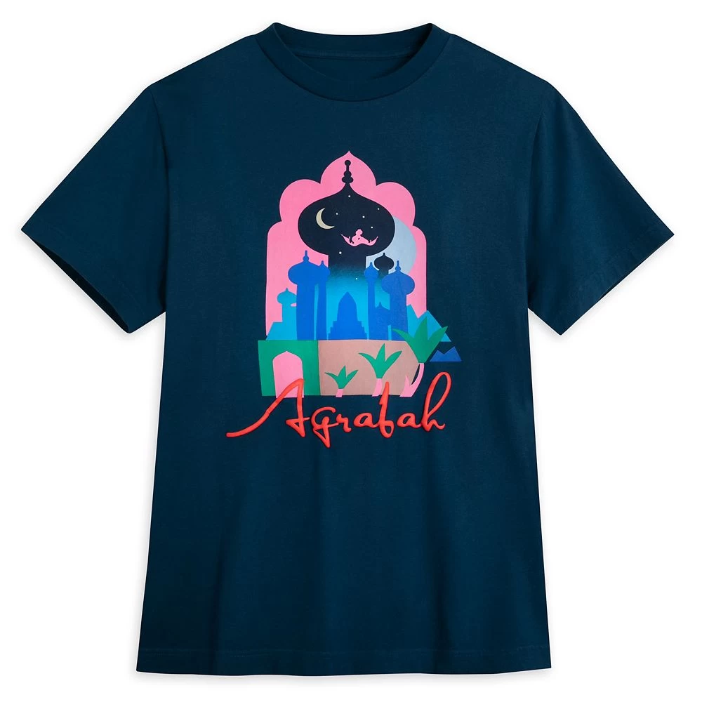 This souvenir Agrabah t-shirt is hotter than hot in a lot of good ways. Jasmine’s desert kingdom, as seen in Disney’s Aladdin, is portrayed in graphic travel poster style art with puffy ”Agrabah” lettering. It’s a wish come true!