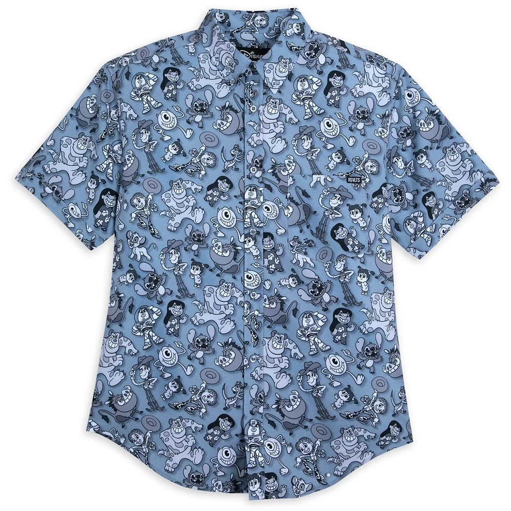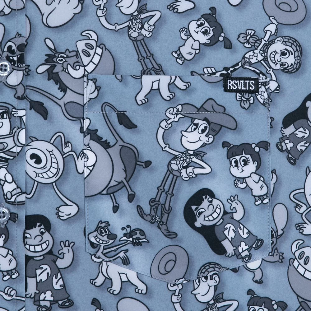 You’re invited to a ”Pie-Eyed Party” with this allover print shirt by RSVLTS featuring Disney and Pixar favorites in retro-cartoon styling. The button down design has a classic look and construction, as it’s made from RSVLTS’ proprietary KUNUFLEX, a four-way stretch fabric that’s designed to keep you cool.