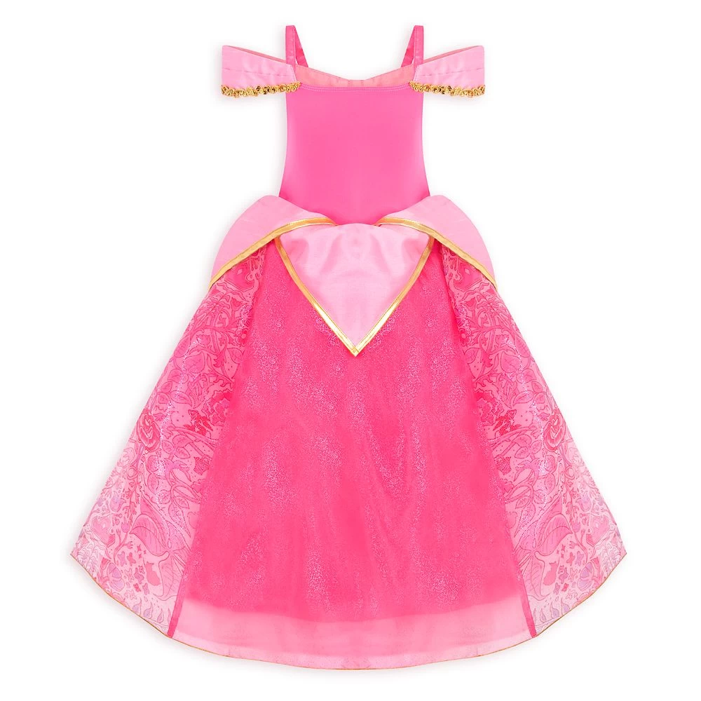 Make it pink! Inspired by Aurora’s iconic gown in Walt Disney’s Sleeping Beauty, this dreamy costume dazzles with golden trims, a sequined bodice, layered skirts with forest filigree, textured organza peplum and a pleated collar. The enchanting look is topped off by a bejeweled brooch that adds a touch of magic to the timeless gown.Β