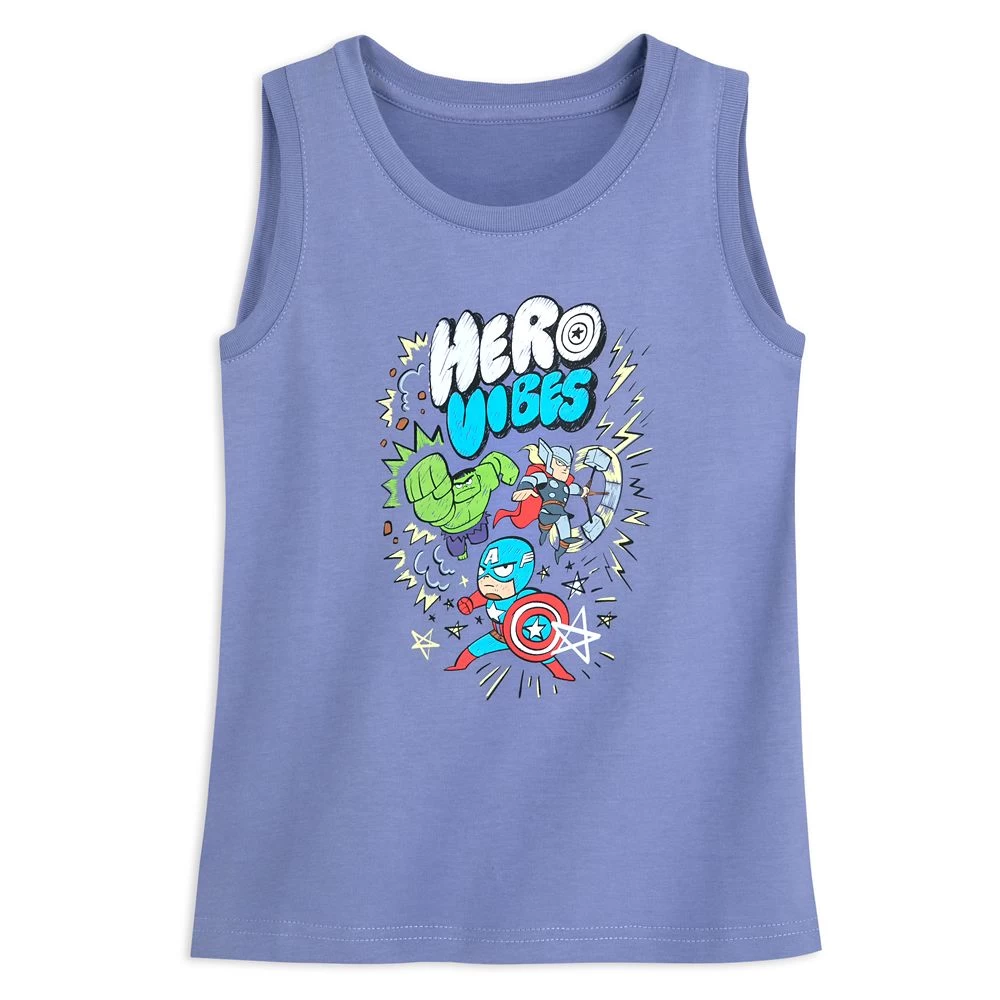 They’ll get ”hero vibes” when wearing this all-out action tank featuring cartoon interpretations of mighty Marvel Avengers Captain America, Thor, and Hulk. It’s a smash!