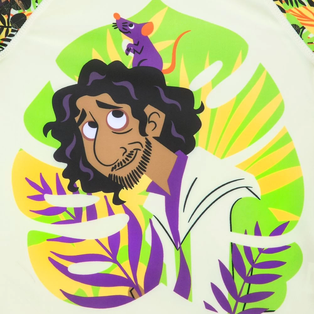 The mysterious Madrigal uncle comes out of the dark and into the sun with this adorable Bruno rash guard. He poses with a little furry friend on the front, while the long raglan sleeves feature an allover print of Bruno and his pals surrounded by lush tropical flora. So comfy, colorful and fun, it offers UPF 50+ built-in UV protection. Need we talk about anything else?Β