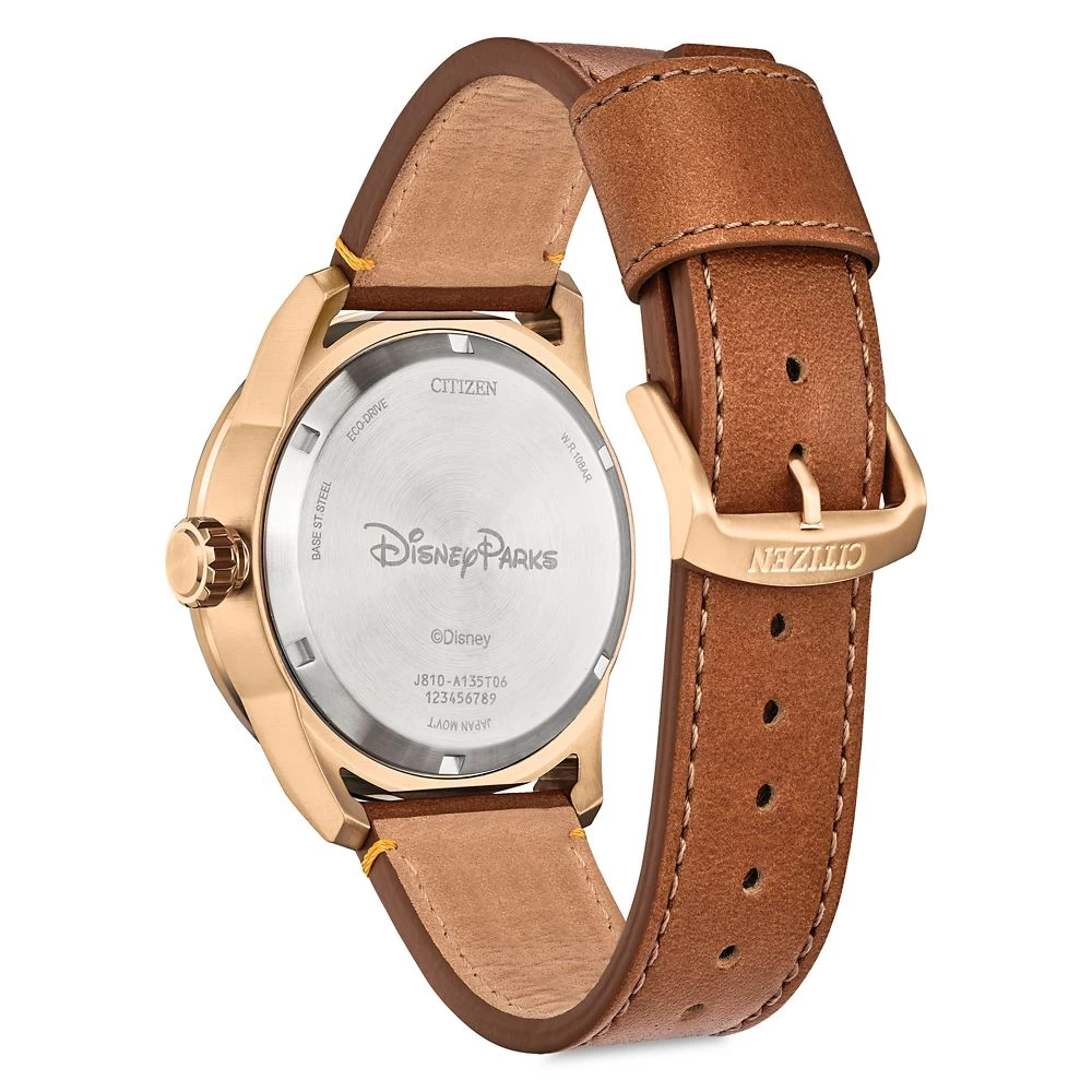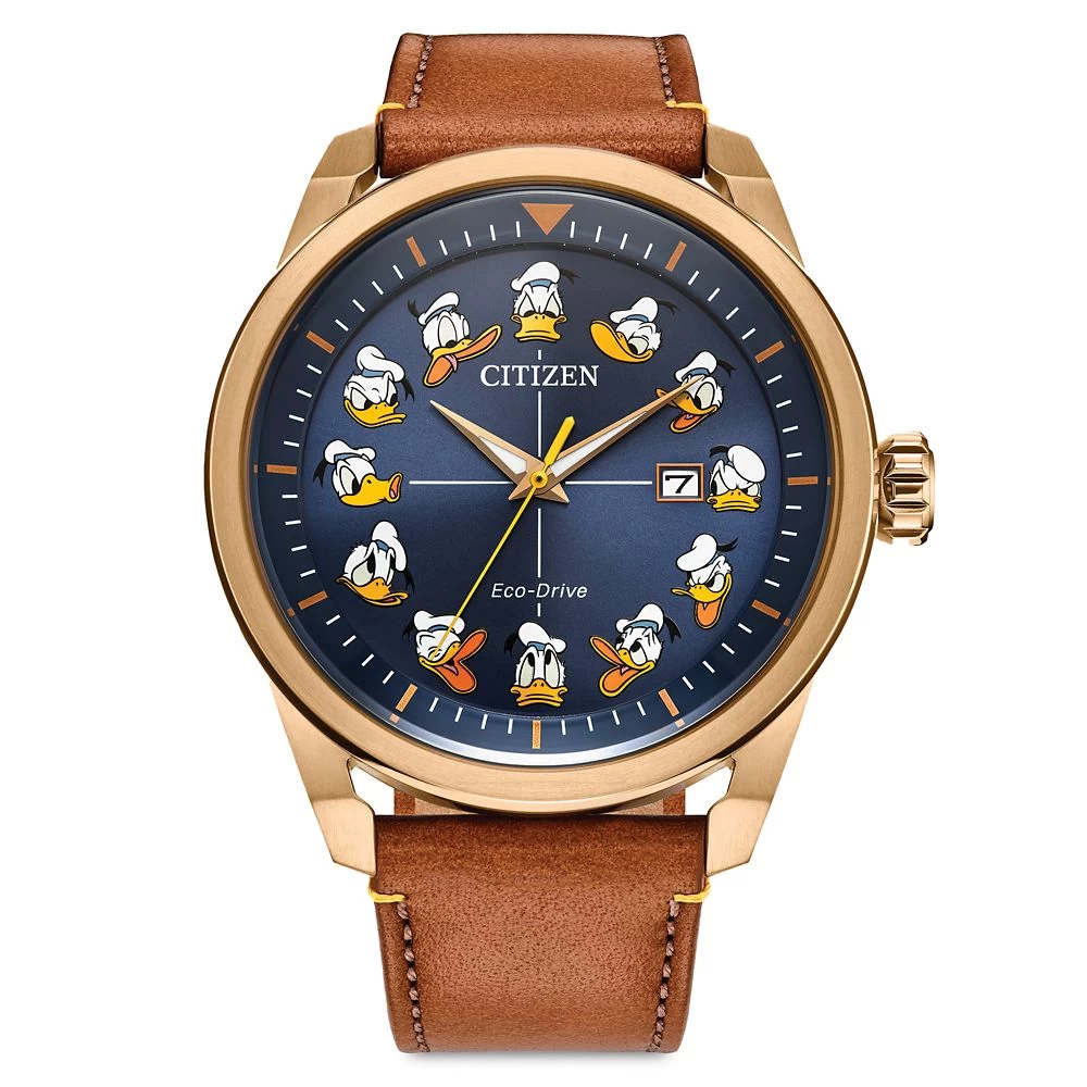 It’s Donald o’clock any time of day with this classic Donald Duck watch by Citizen. The many moods of Donald represent the numerals on this stylish timepiece with a rose goldtone stainless steel case and genuine leather band. Powered by Eco-Drive technology, it can run for months once fully charged, and that should put a happy face on anybody, even Donald.