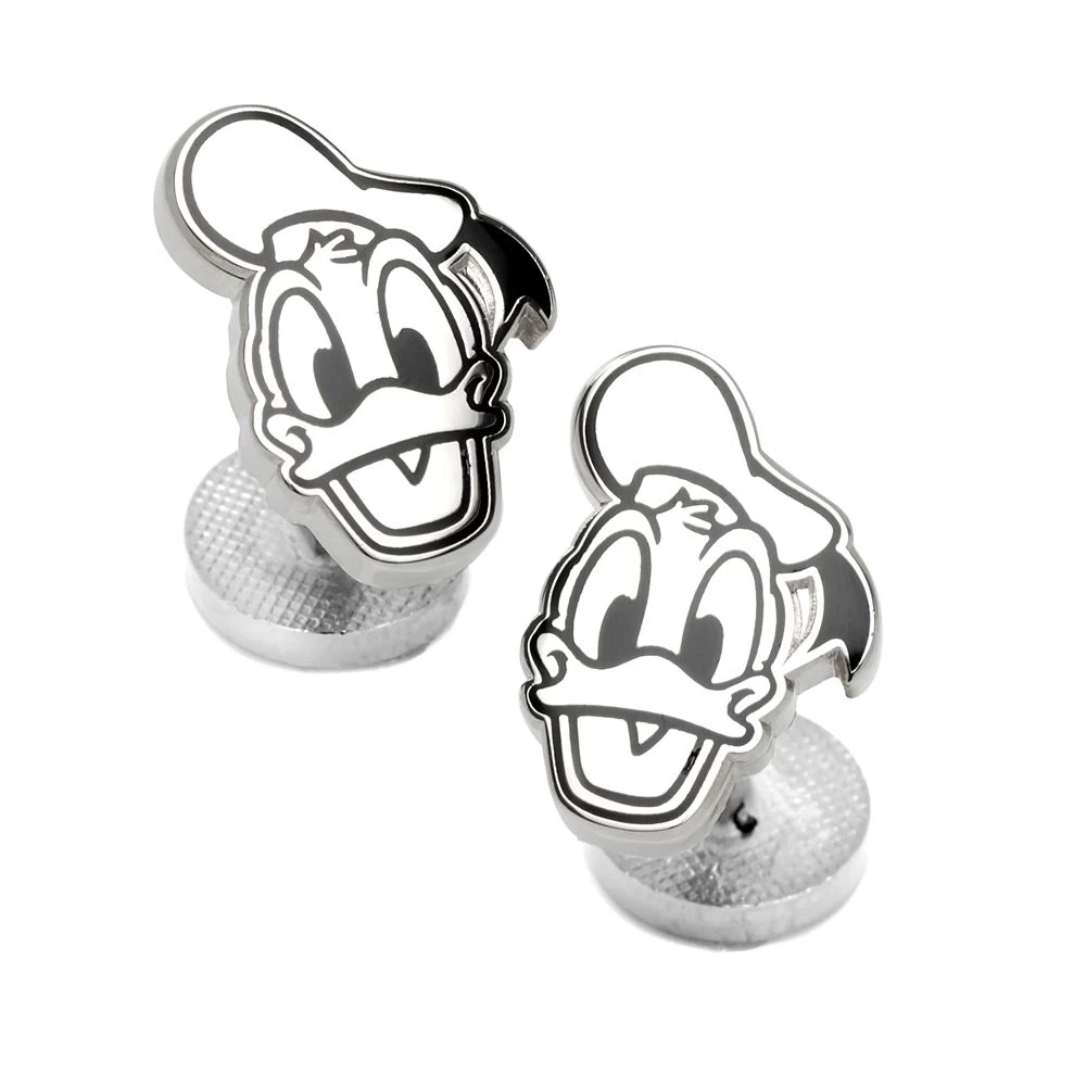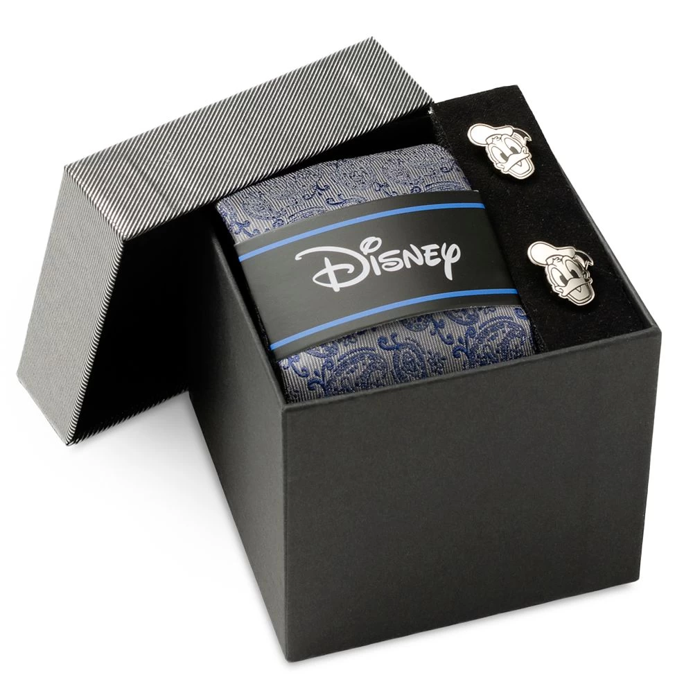 The perfect surprise for Dad or your favorite grad, this Donald Duck tie and cufflinks gift set is sure to add character to any look. The 100% silk necktie features an allover paisley pattern that subtly incorporates Donald’s adorable face. The matching enameled cufflinks are a breeze to slip on and are accented with an anchor stamp on the back. The set adds personality and flare to any look because nobody ever said dressing nicely shouldn’t be fun. Â