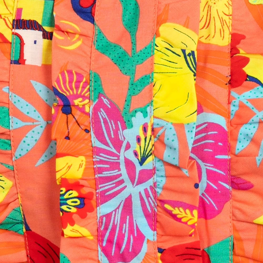 Spark a little springtime magic with this vibrant print sundress covered in marigolds, butterflies and the enchanted casa itself. Layered ruffle skirt and puff sleeves lend a frilly fantasy to the look while a smocked back provides stretch for a stylish silhouette.