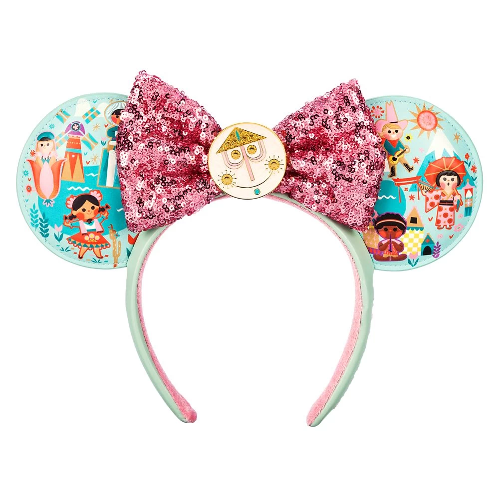 This simulated leather Minnie Mouse ear headband with sequined bow and cloisonné clock face centerpiece is a sign of friendship for everyone, and a sparkling souvenir of the Disney it’s a small world attraction to enjoy for ‘ears to come.