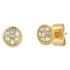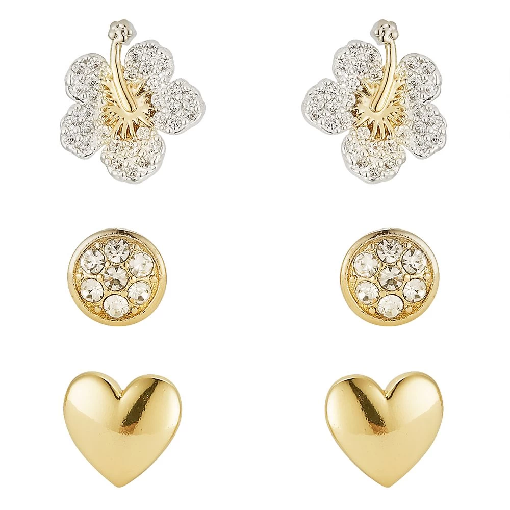 Mix and match Hawaiian style with this set of three different pairs of earrings inspired by Disney’s Lilo & Stitch. The three designs include a pair of cubic zirconia gold two-tone beautiful hibiscus flowers, a pair of goldtone hearts, and a pair of round goldtone earrings encrusted with clear pavĂ© crystals.