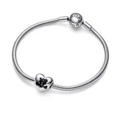 Celebrate a forever love with the Mickey Mouse and Minnie Mouse Heart Charm from Pandora. Mickey and Minnie’s love abides in this heart-shaped sterling silver charm, featuring a silhouette of the iconic couple in black enamel, sitting back-to-back and holding hands. The other side features the engraving ”Always + Forever” and a red enamel heart with the ”+” visible through the enamel. A love-filled gift for a special Disney fan.