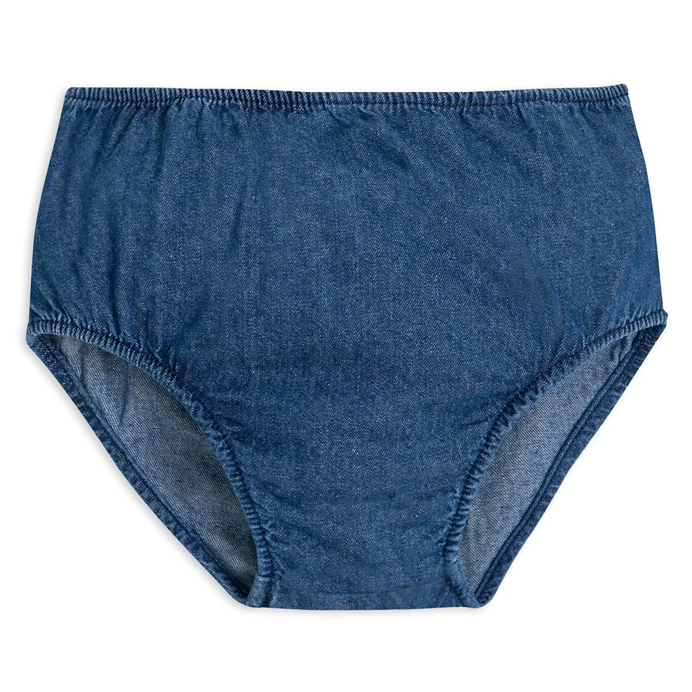 Mickey, Minnie, Daisy and Goofy are in a playful mood on this denim dress for baby. The four friends are pictured interacting with the two front pockets of this sleeveless summer outfit that includes coordinating bloomers to complete the cute look.