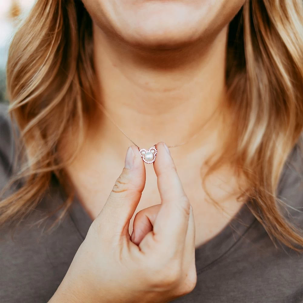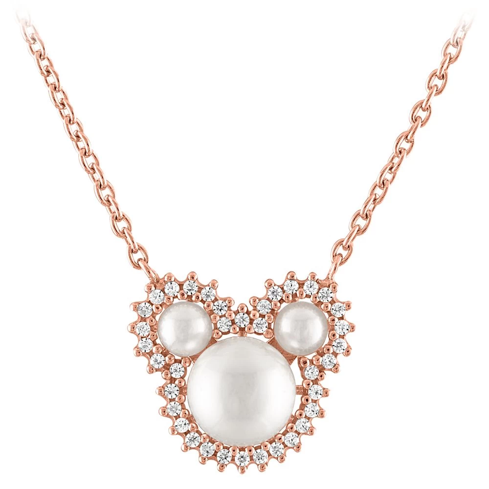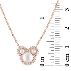 Whimsy and wonder meet elegance and sophistication with this Mickey Mouse icon pearl necklace created by renowned jewelry designer Rebecca Hook. This dazzling sterling silver necklace has an 18k rose gold finish with simulated pearls surrounded by sparkling cubic zirconia stones. This special necklace is a dazzling expression of love and joy just where you want it most, close to your heart.