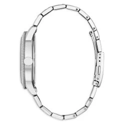 A dashing twist on a classic design, this Mickey Mouse Eco-Drive watch by Citizen features action-packed vintage-inspired art of Mickey with articulated arms that form the hour and minute hands. With an elegant silvertone case and textured, coin edge bezel, this new favorite has three-hand movement, date function and a sleek fold-over clasp for a minimalist look that is sure to always keep in step with fashion.