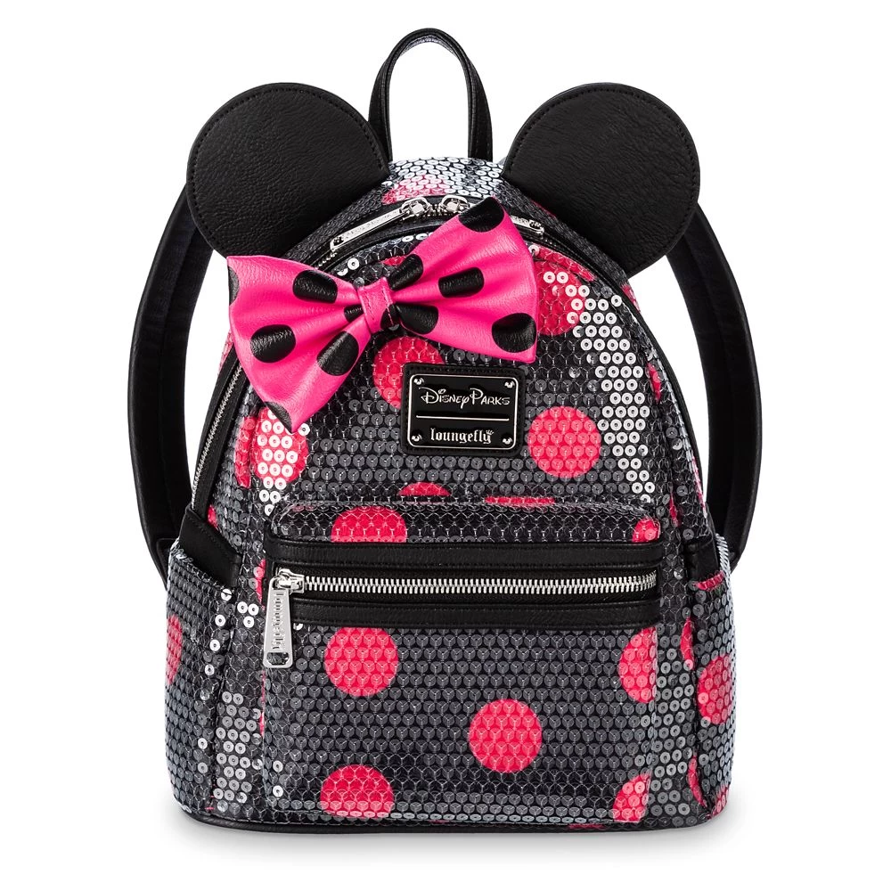 Show off your sparkly spirit with this hot pink polka dot Minnie Mouse mini backpack by Loungefly. Featuring a sequined top layer and a bow set at an angle, this faux leather backpack will tote your essentials in sweet style!