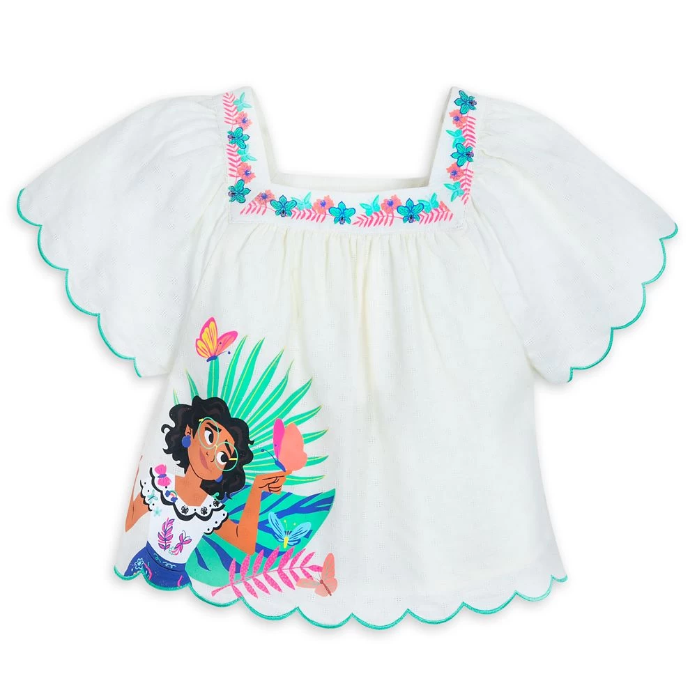 They will look so charming in this fashion top inspired by Mirabel’s signature look in Disney’s Encanto. This adorable smock top blouse features a sweet jacquard weave, colorful screen art of Mirabel and butterflies and scallop edges on the flutter sleeves and hem. So soft and pretty, it can dress up a casual look or feel right at home at a party.