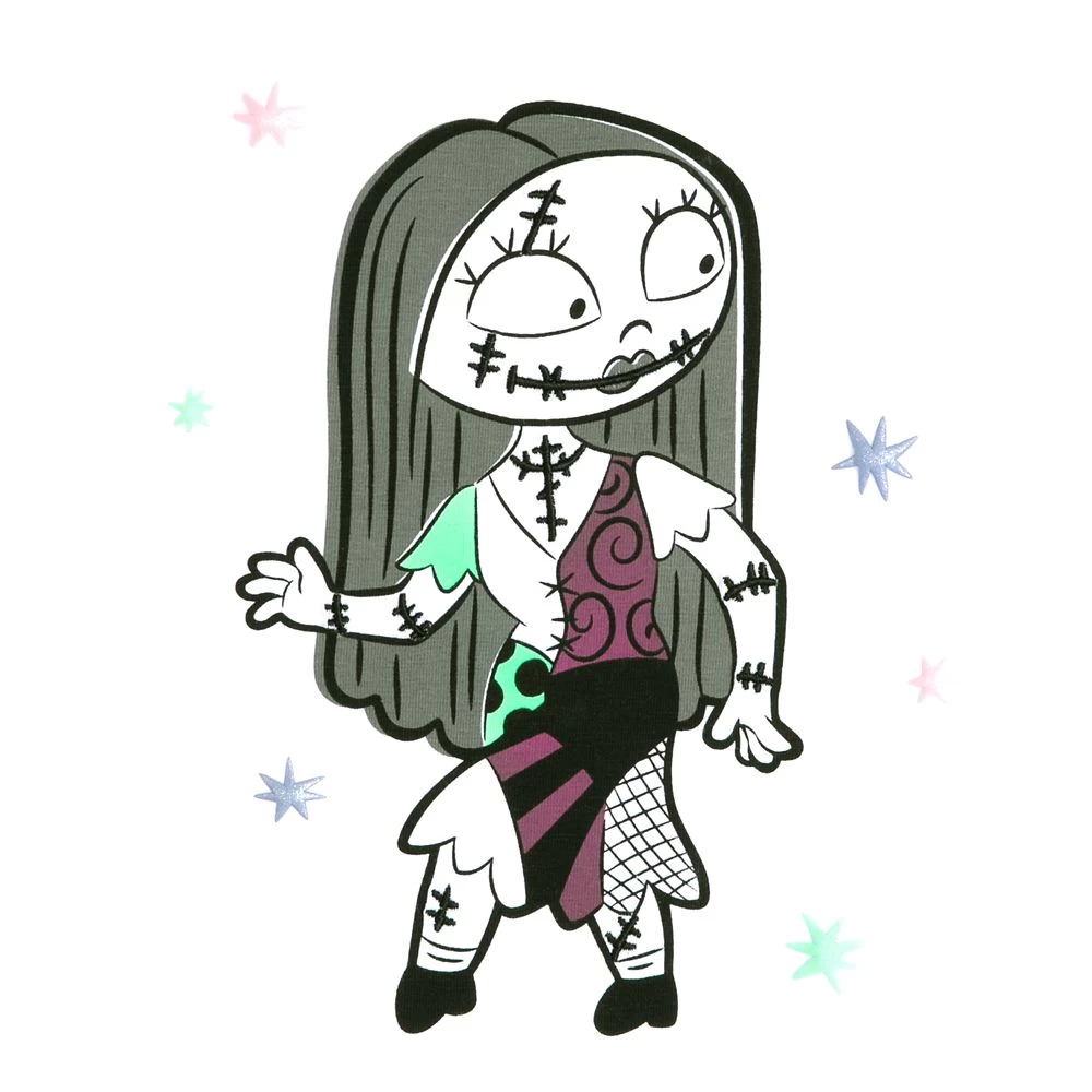 Patchwork girl Sally from Halloween Town will keep kids in stitches when wearing this trendy fashion tee. Inspired by Tim Burton’s The Nightmare Before Christmas, it features ruffled wing sleeves and puffy glittering stars.