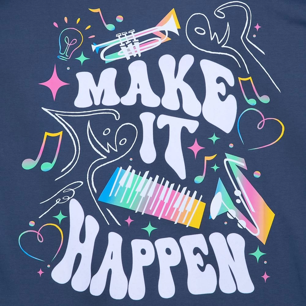 ”Make it happen” in this double-sided Soul tee with Twenty Two character graphic on front and text on the back, all in rainbow hues. Live every minute in it!