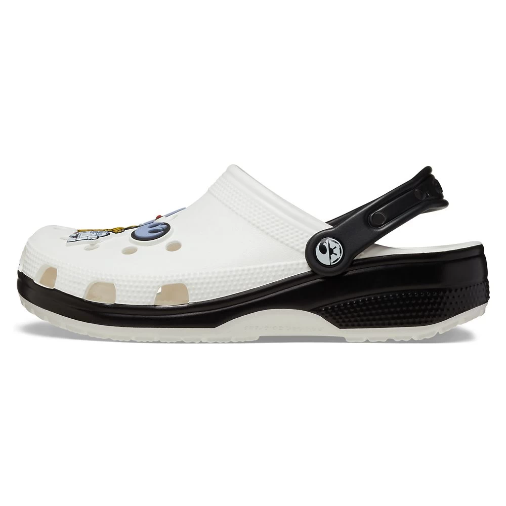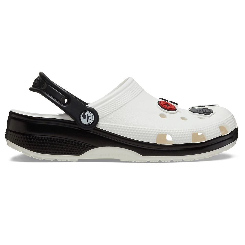 Show your allegiance to the Force and to the Star Wars saga with these clogs by Crocs. With their black and white design, they are both on the light side and the dark side. It’s a theme that extends to the molded vinyl fixed charms which include the Rebel Alliance and Galactic Empire symbols.