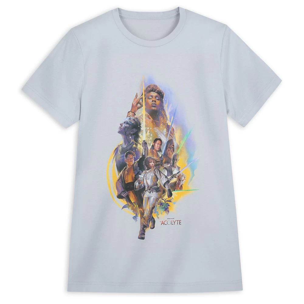 During the time of the High Republic, a mysterious and shocking crime spree sets a Jedi Master down on a dark path where nothing is what it seems. Star Wars: The Acolyte, a new live-action series streaming on Disney+, inspires this t-shirt featuring dramatic screen art depicting some of the main characters from the series including Mother Aniseya, Mae, Master Sol, Jecki Lon, Kelnacca, Vernestra Rwoh, and Yord Fandar.