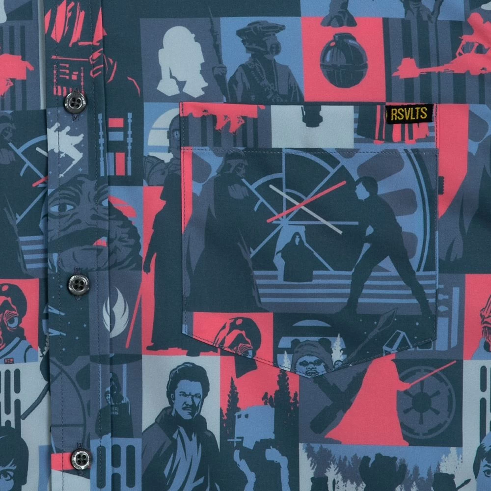 One classic inspires another with this Star Wars ”Trilogy’s End” KUNUFLEXโข shirt by RSVLTS. Inspired by Star Wars: Return of the Jedi, the dramatic allover pattern features key moments and characters from the epic film including Luke Skywalker, Lando Calrissian, Darth Vader, Boba Fett and others. Classically styled with a button collar, button front and a shirttail hem, this short sleeve shirt is as comfortable as it is stylish. Like the film that inspired it, it’s destined to be an all-time favorite.