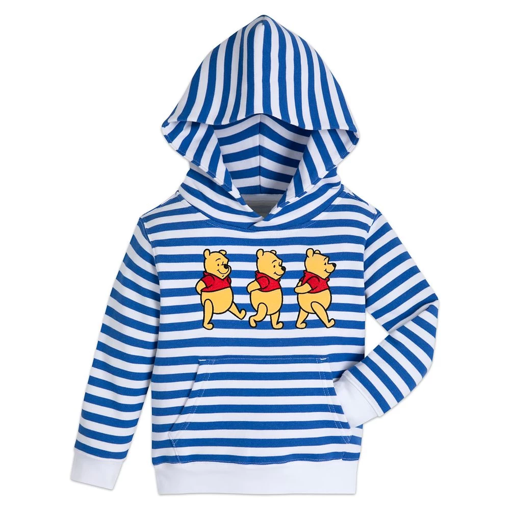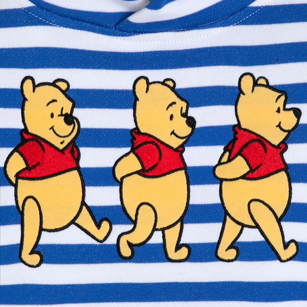 Blustery days are no bother with Winnie the Pooh. This striped print pullover hoodie features a warm fleece interior and contrast ribbed trims, a pouch pocket, plus embroidered Pooh appliquΓ©s across chest. Wear it every ”windsday” or any day.