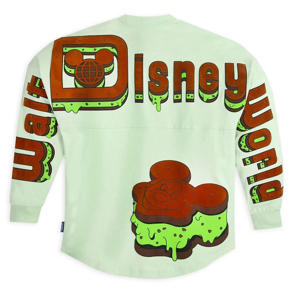 Fans of the delicious Parks ice cream sandwiches will be sweet on this mint green Spirit Jersey from The Most Magical Place on Earth. One of the popular Mickey icon-shaped treats is featured on the back below the Walt Disney World logo spelled out in lettering resembling the mint chip ice cream snack.Β Brown flocking makes it look oh so yummy andΒ a tasteful addition to your wardrobe.Β