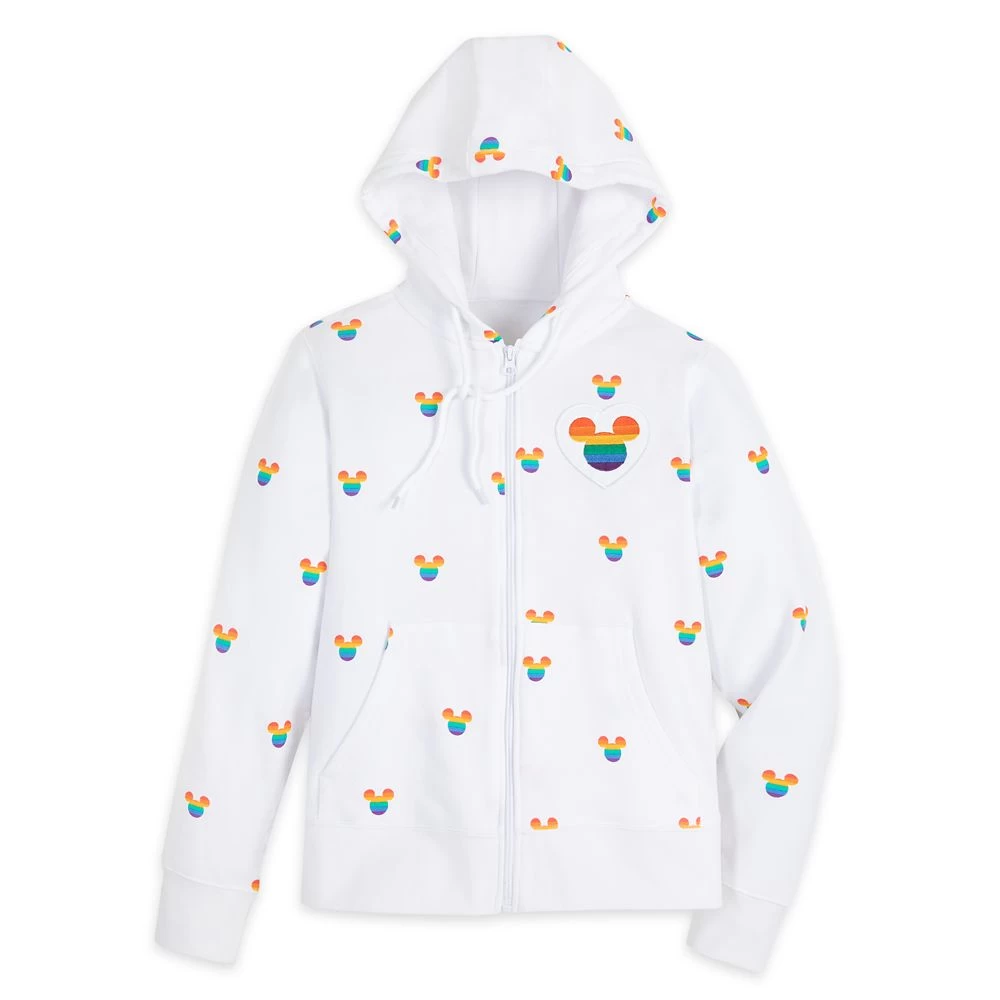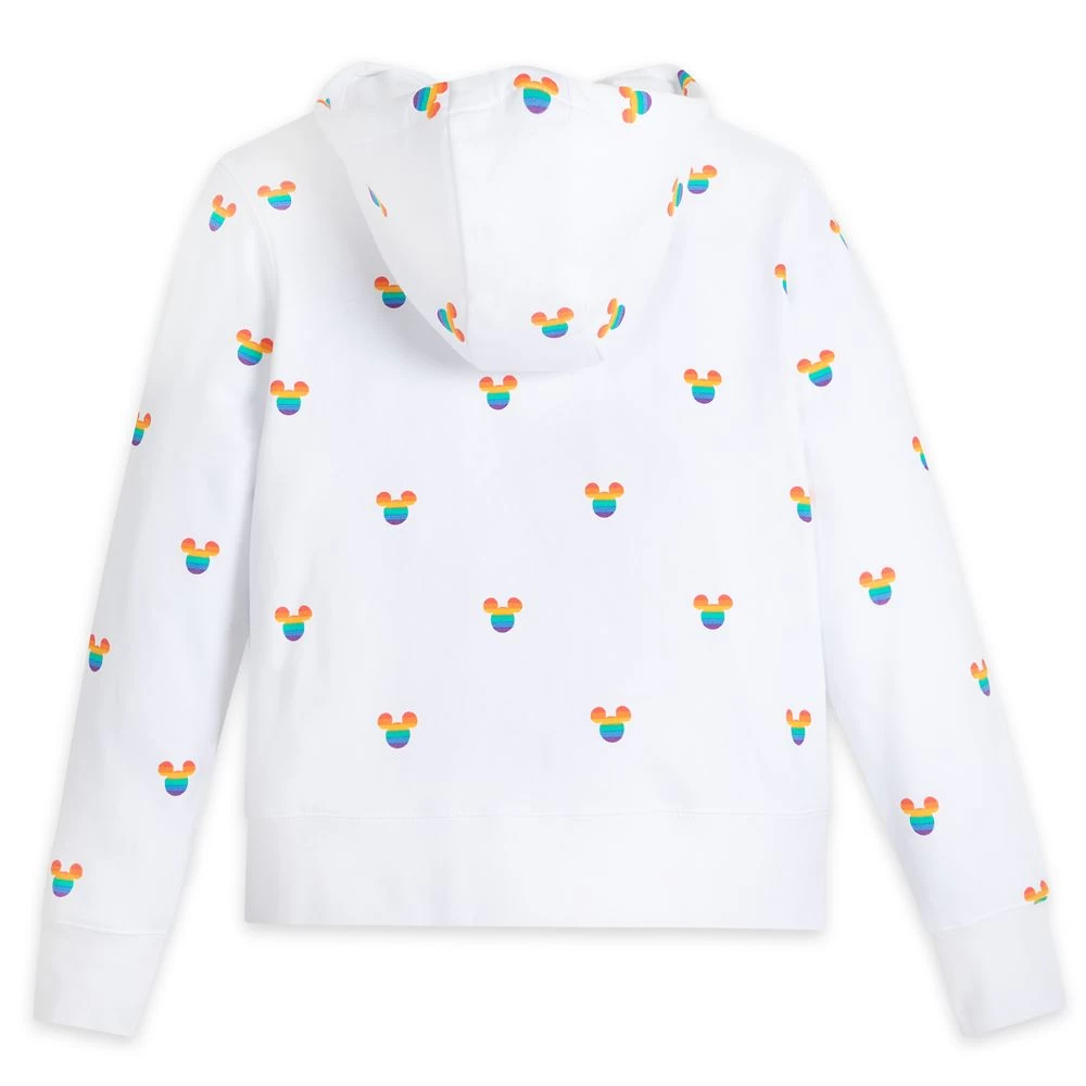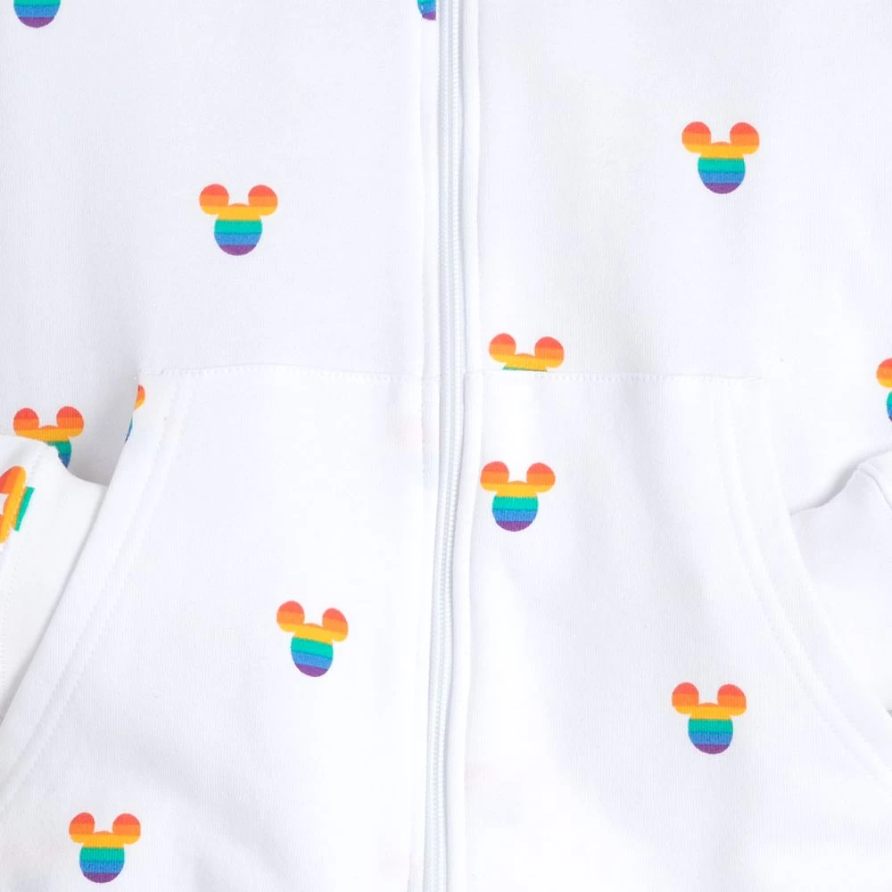 Win hearts while warming your world in this zippered hoodie sweatjacket. It features an allover print pattern with an embroidered heart shaped appliqué on chest, all featuring a rainbow striped Mickey Mouse icon. Trendy touches like a boxy fit and extra long sleeves will make you proud of your bold fashion choices.